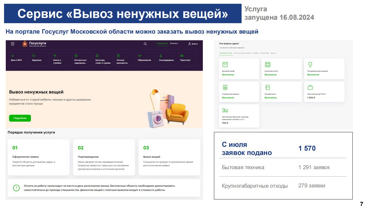 На совещании обратили внимание на навалы из мебели и техники возле подъездов многоквартирных домов. Глава городского округа Пушкинский Максим Красноцветов напомнил, что на такой случай есть специальный сервис на сайте «Госуслуги Московской области» — «Вывоз ненужных вещей».