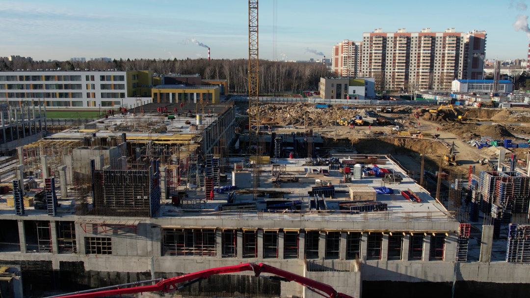 На стройплощадке работают почти 400 человек и 32 единицы техники. Строители устанавливают конструкции главного корпуса, подземной части и выполняют гидроизоляцию. Монолитные работы завершатся к октябрю, и летом, параллельно, начнутся фасадные и внутренние инженерные работы.