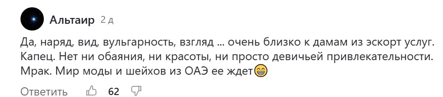 «Да, наряд, вид, вульгарность, взгляд ... очень близко к дамам из эскорт услуг. Капец. Нет ни обаяния, ни красоты, ни просто девичьей привлекательности. Мрак. Мир моды и шейхов из ОАЭ ее ждет», - отметил Альтаир.