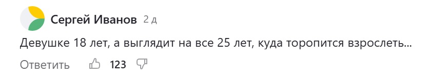 «Девушке 18 лет, а выглядит на все 25 лет, куда торопится взрослеть...», - считает Сергей И.;